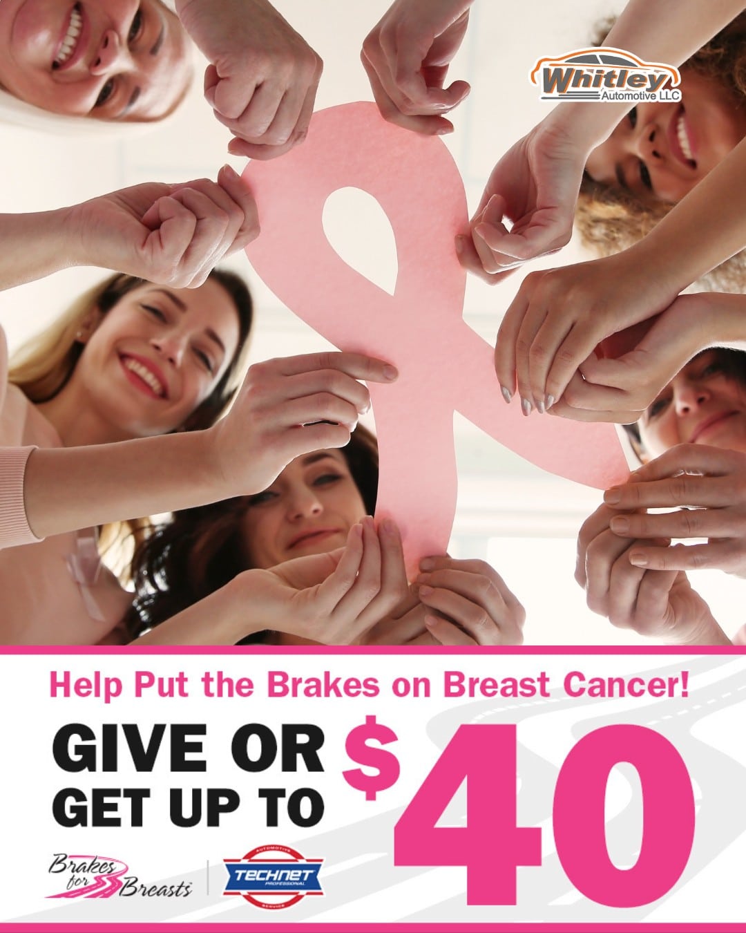 Here at Whitley Automotive, as a TechNet Professional shop, you can also GIVE or GET $40 back on your qualifying brake service between September 1 – October 31. Then, 10% of your total brake repair will be donated to the Breast Cancer Vaccine Research Fund at the Cleveland Clinic.